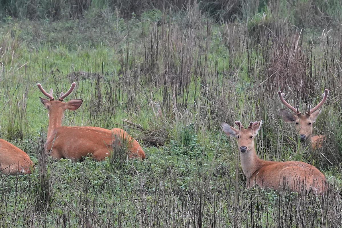 A couple of minutes later we decided to continue on back to the gate as Tokibjee heard the calls of Swamp Deer coming again from that direction. A few minutes later we were up on the short elephant mounting post and using it as a watchtower alongside a film team making a documentary on Kaziranga. Our gaze was focused on a massive beel like clearing amidst a sea of tall grass 400m away. This clearing was full of Rhino, Wild Buffalo, and many Hog Deer, with the Hog Deer and the Wild Buffalo standing alert as they looked in one singular direction on the edge of the clearing. The Hog Deer soon started calling more frantically as they looked on in that direction, and were fairly obvious in their increased threat perception with their tails raised up and the white fluff behind showing up like elevated cotton strands. Suddenly one of the guys near us said there it is, as he noticed the Tiger having appeared in view. Getting one’s bearings in a new wilderness habitat still takes a while no matter how many forests one has been to, and it still took me a few more seconds before I finally noticed the shape and the gait of a big cat, as it strolled out casually into the clearing. The Binoculars revealed it was certainly the Golden Tiger, and was certainly exciting for all of us as we watched it walk in full view of all the deer, wild buffalo, and unconcerned rhino. Suddenly one of the guy’s said there’s another one appearing behind. Once again looking through the binoculars one noticed a second big cat, but this time a normal Tiger, as it walked 50-60m behind the Golden one and more along the edge of the tall grass as opposed to the one in front walking more centrally. The normal coloured tiger soon vanished back into the grass, while the golden coloured one stalked itself into a crouch. A minute or so later it suddenly sprang up and charged after something in the grass and vanished. The Hog Deer followed in it’s direction but kept their distance as they continued to stay alert and alarmed. The Buffalo staring in alarm all this while soon started to graze again, while all the rhino remained unconcerned. We waited another half hour, with the hope one of them would appear back into the clearing again, but the Hog Deer had gone calm a while ago as well, and few if any alarms persisted thereafter.