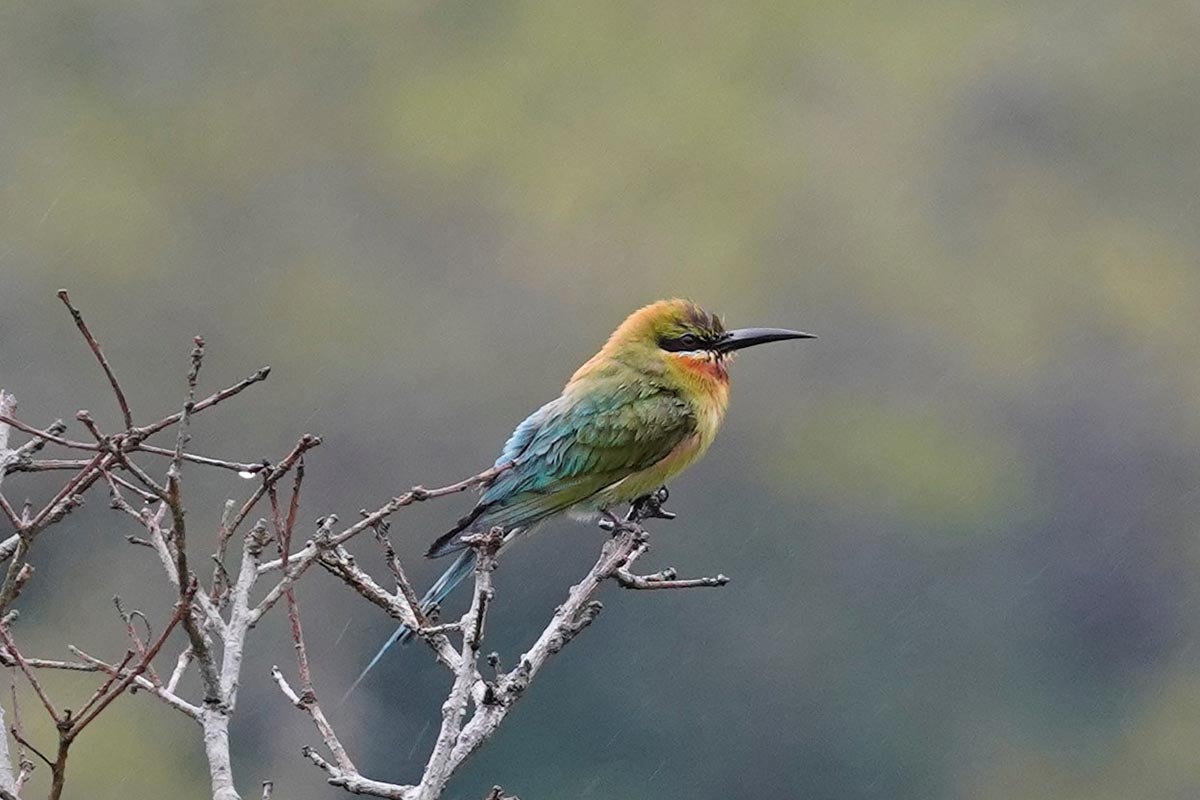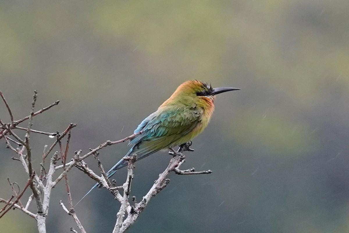 The decision turned out to be a good one, as the rain ebbed into a drizzle and allowed one to appreciate the stunning blend of grassland, hill forests and Brahmaputra flood plains under the beautiful overcast sky. The wildlife included super and close up views of multiple Hog Deer, Wild Buffalo, and Swamp Deer, as well as a lone Elephant. The birds offered up great views of Blue-tailed Bee Eater, Great Myna, Changeable Hawk Eagle, Tree Pipit, and constant fleeting and trilling Scarlet-backed Flowerpeckers. Fell asleep multiple times on the road back due to the lack of the same the night before, and got in a couple of hours of down time back at the lodge after being reassured the electricity glitch was a one time thing, and I could rest easy from hereon.