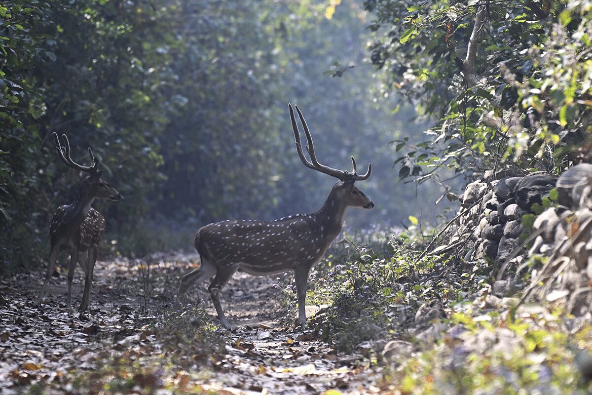 - Two Spotted Deer Stags seen highly alert at the strong alarm of another Spotted deer from within a Wood cutting compartment on the Tanakpur-Kilpura Track. Possibly for a Leopard.