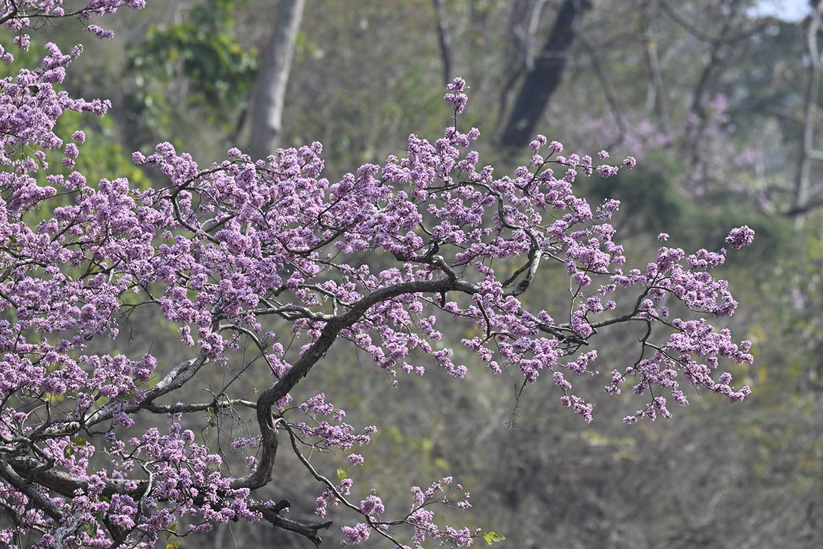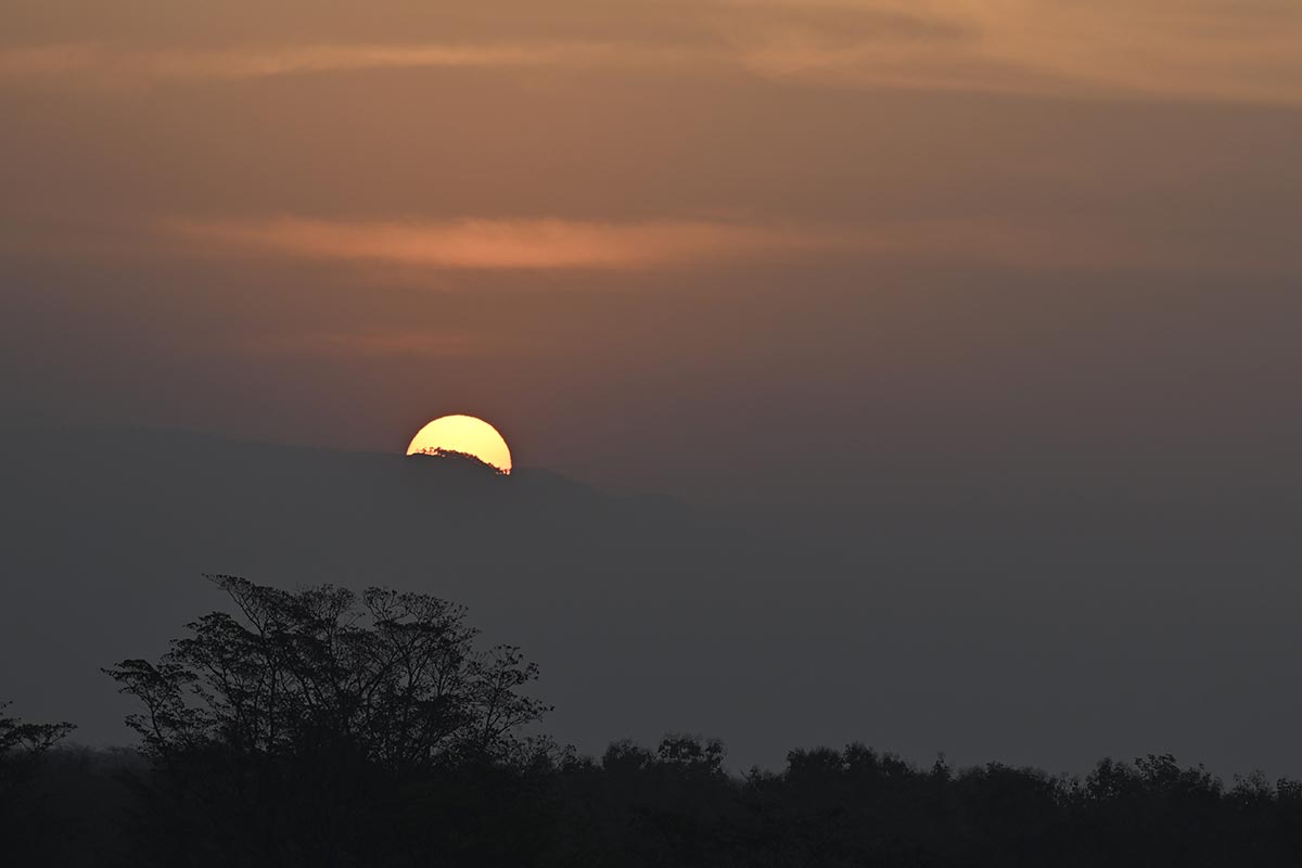 Saw the sunrise over the distant forests of Nepal in the east from the Rest house embankment, while enjoying the birdsong around, and even an elephant trumpet from an area of the forest below. Had initially planned on driving out toward Durga Pipal and exiting the forest from Chorgalia further on. However, we decided to head towards Tanakpur from Kalonia Forest Chowk. Found fresh tracks of a Male Leopard amidst the Terai Bhabhar grassland as we crossed the river bed. However, no birds nor deer etc. indicated any further movement of the cat, and so we continued on. Found tracks of a Sloth Bear a bit further up, most likely from the previous night.