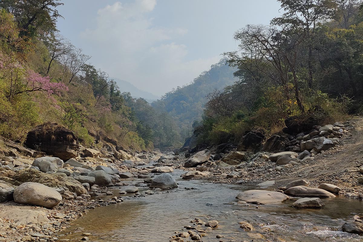 Sambar Alarms from the forest in front of the embankment before dawn. A family of 3 Sambar seen crossing the riverbed on the northeastern side and heading into the forest track that leads to the forest shrine. Sighted a pair of Common Rosefinch after ages just in front of the FRH. Spotted Deer Alarm Calls 1 km before Kalonia Forest Chowki. Drove on the forest track towards Durga Pipal today, and thus explored an area that had been impassable to us till date, due to not having the correct Vehicle, or the road not having been made. Both aspects were checked off today. The track went up through hill forests, and then down through flowing streams, and finally out across through the dry parts of the riverbed, bordered by terai bhabhar grassland and hill forests on both sides. Made it only to Kathol Village halfway to Durga Pipal, and decided to drive back after a cup of tea and maggi from there itself as it was getting late in the morning, and we wanted to get back and rest a bit before the evening drive. Chanced upon Crested and Common Kingfisher as well as plenty of other forest species like Great Slaty Woodpecker, Indian Nuthatch, Greater Yellownape, Blyth’s Leaf and Grey-hooded Warblers and Scarlet Minivet to name a few. Went to Dogadi Village a few km from the Forest Rest House to pick up the guard in charge of the place and got invited to have tea and lunch at his beautiful cottage in the village, in the company of his wife, two teen sons and two adorable little lambs. The evening saw us explore a previously unexplored track through a plantation off the Kilpura road. It hit a dead end after a few km and so we came back and went on the Temple track from near the rest house. Good Spotted Deer Alarms as we returned just after sunset in a woodland patch within the dry river bed near the rest house. However, we were unable to spot anything of note and went back upto the rest house thereafter.