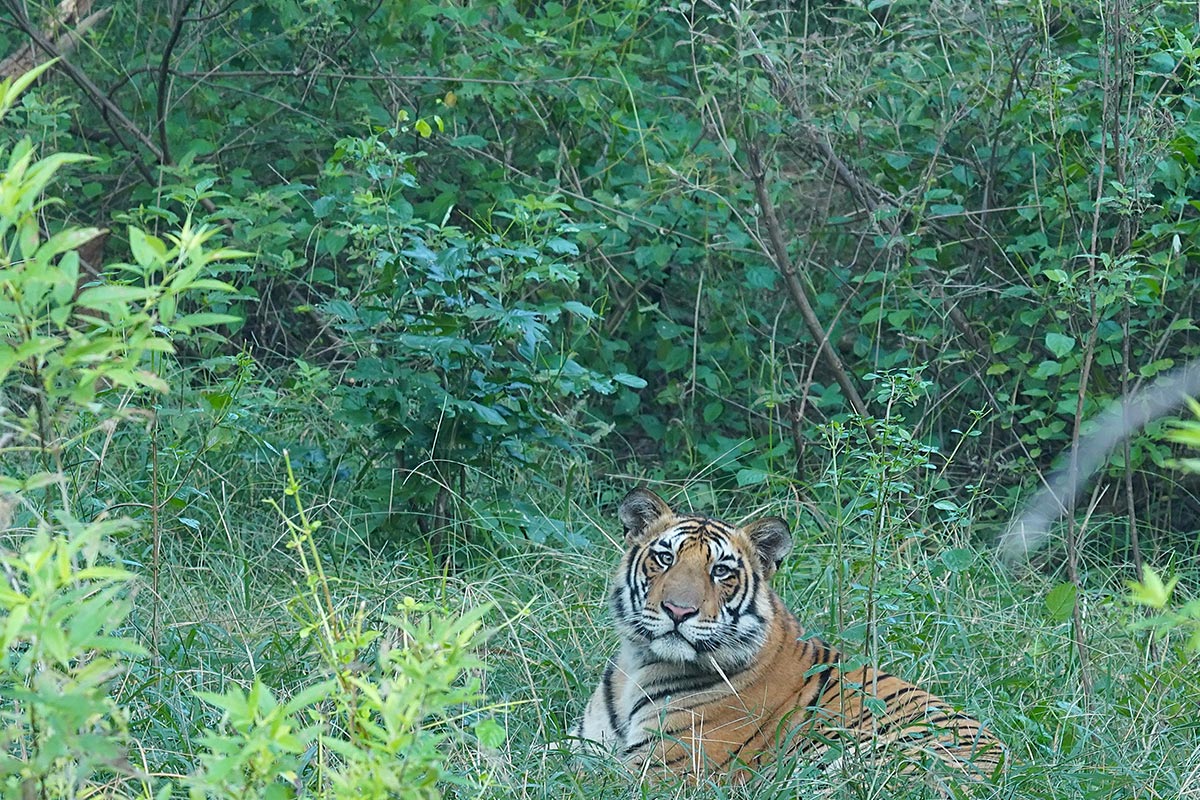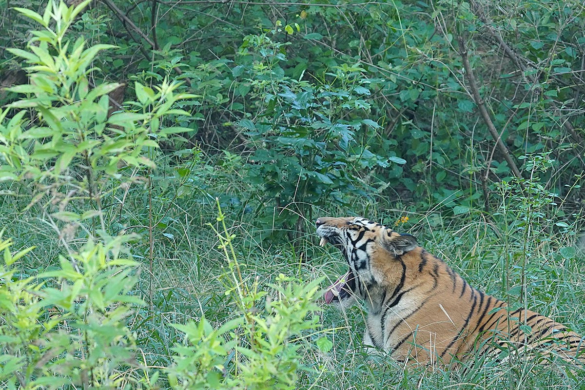 a small clearing of grass next to the road watching both the male cubs as they slowly ambled around. One went back into the thickets after a bit while the other remained sniffing the grass near both the jeeps barely 20feet away. After a minute even he went in to join his brother. A few seconds later one appeared 20m away to our right and was soon followed by the mother. Both then lay down in the grass to relax. The next surprise came when the second male cub entered to join them, cause in his mouth was a freshly killed Sambar Fawn, who had probably been killed either before we found them the first time, or in between the time we saw them and awaited their arrival on the riverside. Either way, it was untouched post being killed. He came first and lay down near the two, and then like a typical sibling began giving low growls and flattening his ears in mild threat as his brother got up to approach him, as he had no intention to share his prize. His brother went back to lay down, after which the one with the kill began to slowly pick it apart, casually play eating with the dead fawn using his paws in between. What was most interesting during this entire period was the constant series of purring low growls one could hear and feel from them as they communicated, albeit without any obvious threat. The next hour turned out to be a real treat, as we got to observe them relax at close quarters and sometimes yawn, then roll around, then rub into each other to reinforce the family bond. We only decided to move once a few more jeeps arrived, and brought with them the noise of predictable excitement at seeing the tigers. They had all found a Male Tiger in another area of the forest that morning, and had thus arrived only now.
