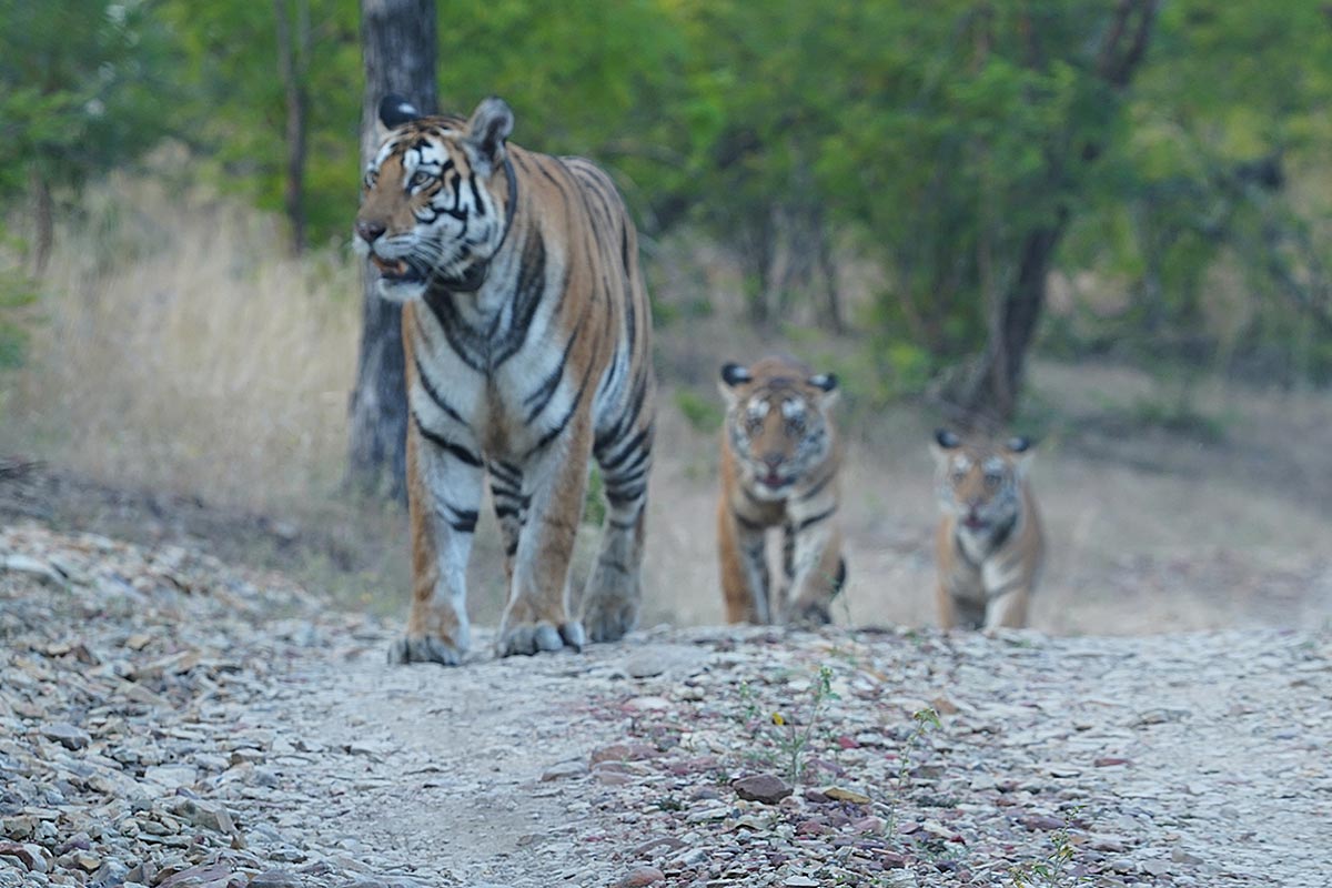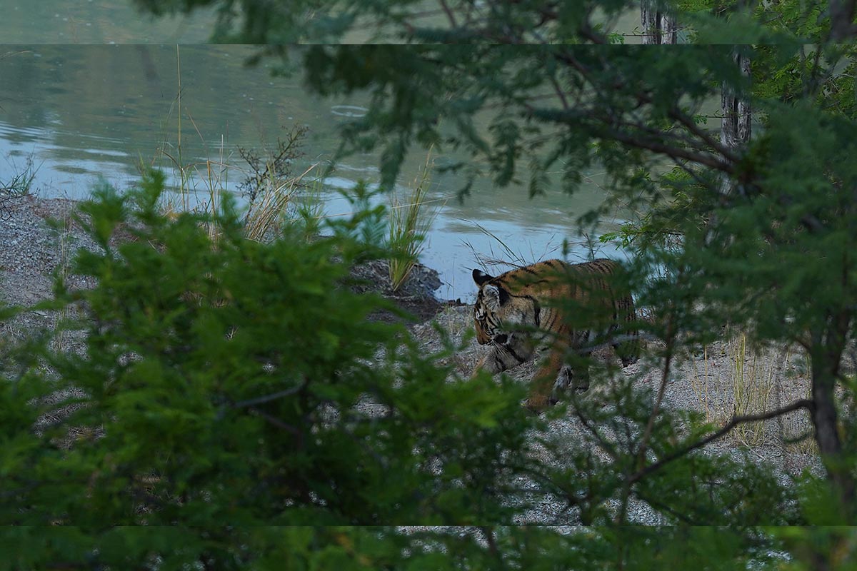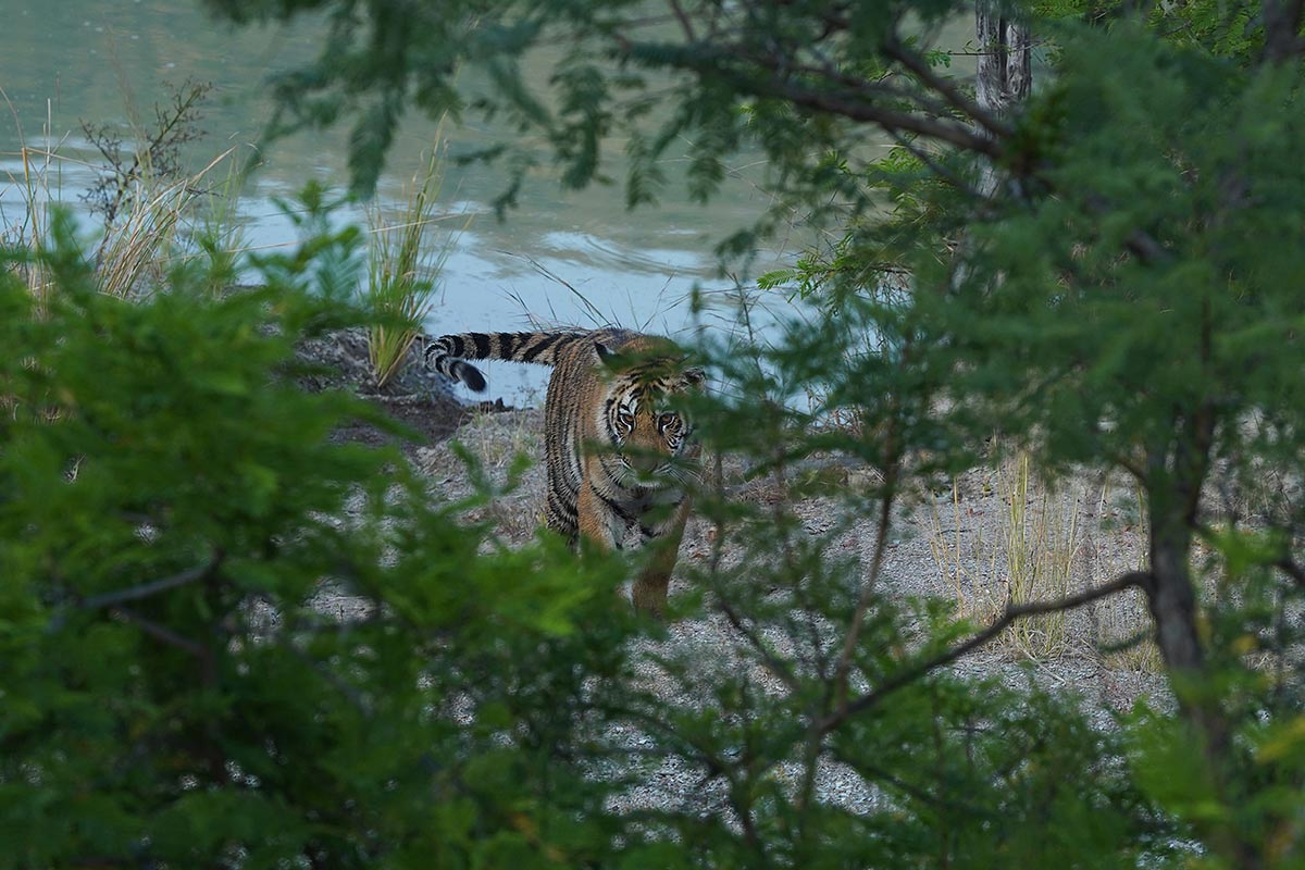 direction of the river we we took the diversion to the river to see if we might get lucky with a sighting. No such luck, and so we went back onto the road a few minutes later and continued on our journey. A minute or so later as we turned toward a slight curve intersected by shallow forest slope on both sides, we noticed a tiger casually walking up just 30m away. It was a fully grown female as we noted, and she didn't even glance in our direction even once as she padded her way into the thickets and made for the direction of the river. This was P141, the resident queen of the area. Little had we lost sight of her, that we noticed another almost fully grown tiger suddenly walk into the space she had just vacated and look at us. From the size of the head, it was apparent this was a male, and before we could make a vague speculation on his identity, we found ourselves looking at a third almost fully grown tiger looking at us having followed up and out behind the previous one. Even though we knew P141 had two 22 month old male cubs (Tigers turn independent at 24 months) it was still a fantastic surprise to see all of them together like this, and so far from where they were anticipated based on reports of them being up on the plateau high above. Gathering ourselves as they all vanished behind the thickets on our side we realised they were heading in the direction of the river, and quickly made our way there, to hopefully catch them coming out. We got to the river and positioned ourselves to the view the point they usually exited. A couple of minutes later a cacophony of peacock alarm calls from within the forest let us know the tigers were approaching. A minute passed, then another, and then another at which point our guide and driver both got a feeling the tigers must be close to the same road we had left them at, because the distance in between was less than 100m of forest, and at their pace they should have walked out already. Doubling back, we headed back onto the road inside, and soon found a jeep ahead signalling to us to slow down as they stood by