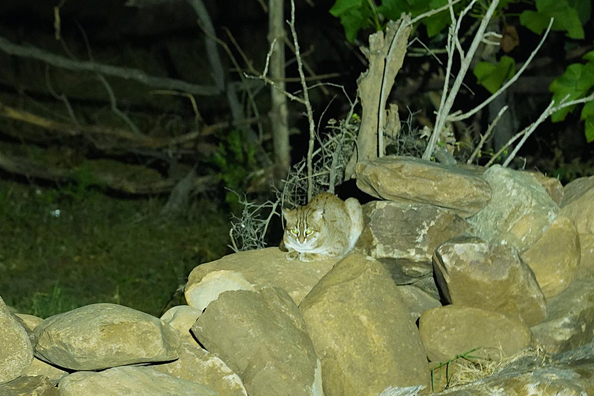 Later that day we skipped our afternoon drive as we rested in to prepare for our night drive just post sunset in another area of the forest. This was a buffer area that had villages and cattle movement during the day, but came alive with a host fantastic wildlife post sunset including Civets, Striped Hyena, Leopard, Sloth Bear, Owls and Small Cats. The highlight of our night was finding a Rusty Spotted Cat. This species is the smallest Wild Cat in the world, with the adult being just a bit bigger than a domestic cat kitten. The larger eyes, vertical stripes in between them, and the beautiful greyish coat contrast superbly with the light rust spots dotting its pelt. The fact that we found it on a wall of rocks layed out by forest guards just behind their hut made the sighting even more incredible. We almost ran into a Striped Hyena on the way back, but it dashed into cover before anybody except our guide could lay eyes on it.