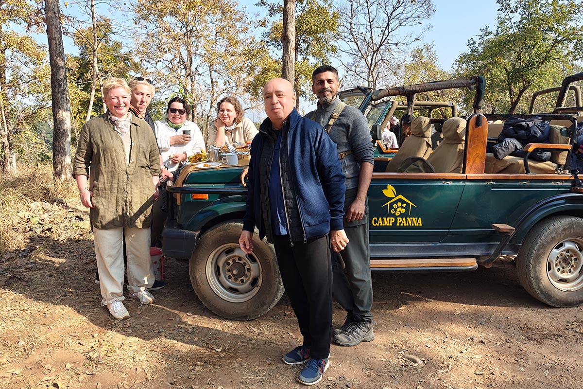 After some extensive planning over the course of a month finally met most the group comprising of Dr. Sudhanshu Tyagi, Maria Zelenskaia, Svetlana Pchelina and Elena Dushutina from Russia at the New Delhi Airport to catch the flight to Khajuraho. After an extensive security check we managed to board the flight at the final call. A short 1 hr. flight later we landed at Khajuraho and decided to have breakfast at Raja Café before heading to the Temples for our guided tour. The group was well versed with Indian food owing to Dr. Tyagi having an Indian Restaurant in Moscow in the early 2000’s and so feasted on Aloo Paratha with fresh dahi and chutney along with Masala Chai. Our guided tour started at noon, and was going well as we covered the first temple over the course of an hour with our guide Mr. Awdesh Kaushik. However, as most had not slept since the night before, as well as the sudden heat of the day exhaustion soon set in and we cut our tour short and headed to Greetoe Camp Panna, where we would be staying for the next 3 nights. Bought some Electral for the group on the way to have them rehydrate and help recover. Post check in everyone retired to the rooms to rest. We had no other activities planned that day, and so it helped everyone ease into the trip. Everyone felt well when we met in the evening, and retired early after dinner as we had an early start the following morning for our first safari in the park.