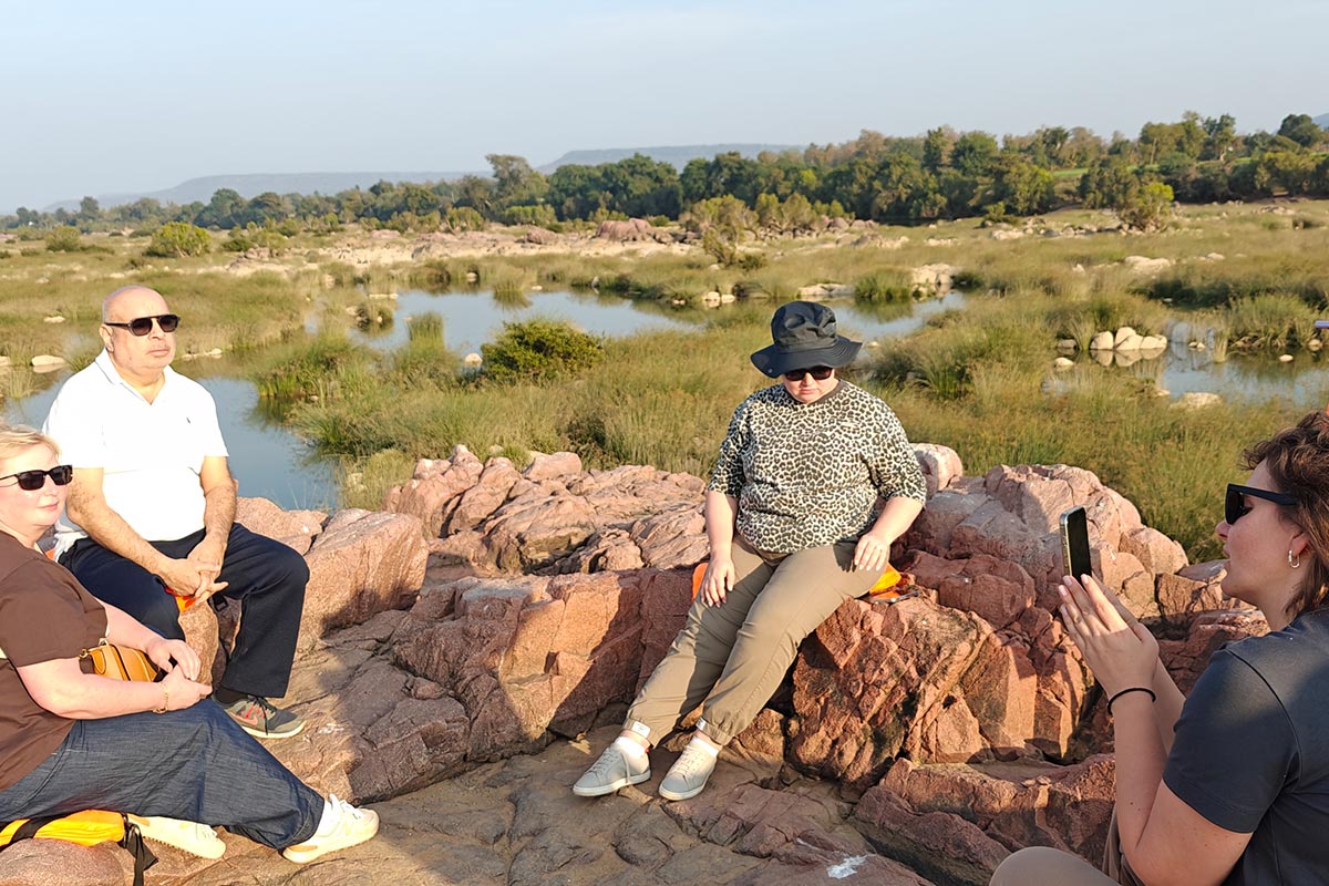 We were joined by our last group member Marina Yanvareva early in the afternoon after she had flown in earlier that morning from Delhi and done the Temples tour organized for her. Our Evening had us booked for the Night Safari in the Jhinna Buffer located 30 min from the camp. However, the camp organized a very lovely and exciting cutomised high tea experience by rowing us via their personal boat to a nearby island in the river.
