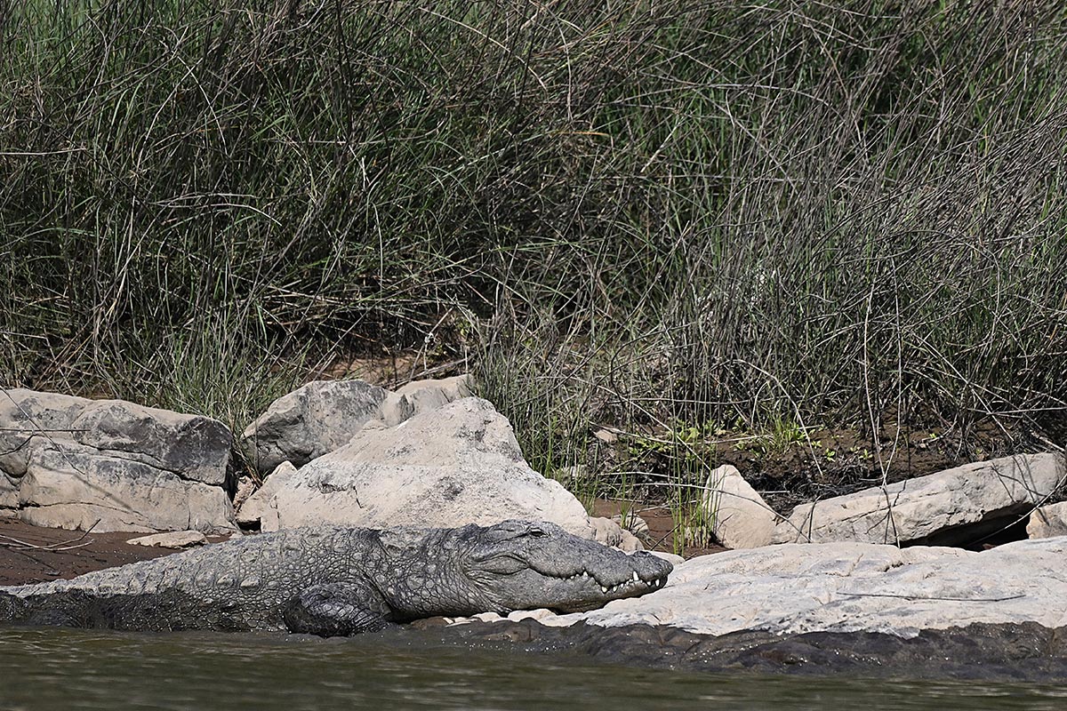Soon all the vehicles had left and we were told that it was because P151 had been sighted with a Sambar Kill in the Pakkagadha-Chwai junction (exactly the area we had tracked and left the Sambar alarm a little over an hour ago that morning. We decided that we would go check on her whereabouts after our short 20 min Motorboat Safari. The boat safari was a wonderful experience for all and yielded multiple crocodiles, be they basking on the riverbank and islands in between or swimming in the water.