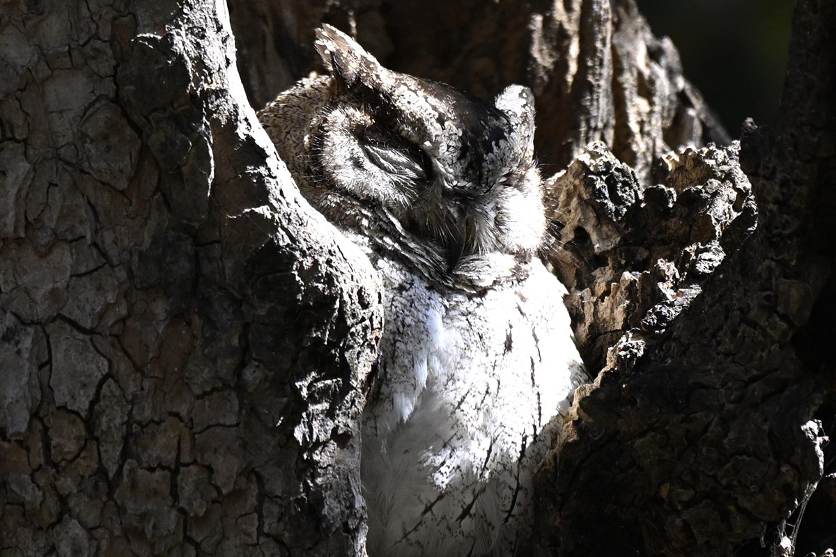 Owl sitting perched upon a thick branch of a shaded tree as we crossed a dry streambed nearing the
