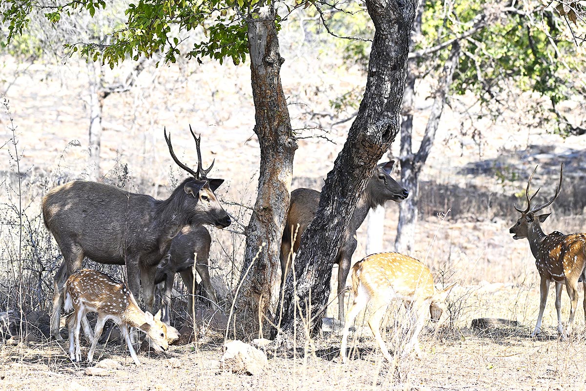 The morning saw us enter post 6:30 AM to avoid entering with the logjam of the vehicles at that hour. As we headed close to the river we saw the tracks of an adult female tiger and then heard multiple spotted deer and sambar alarms from near the river bank close to us. The driver and the guides said the tiger was most likely “P151” Who currently had two 4 month old cubs as well. The safari motorboat also came to the point where the spotted deer had been calling, and kept trying to locate the tigress, but were as unsuccessful as the rest of us. We then decided to go upto Suarkoh plateau slightly above the river valley, as alarms of Sambar deer had been taking place there as well. As we were watching a small family of Sambar there, we were alerted by the alarms of Sambar and Spotted Deer from further up near the Pakkagadha-Chwai junction and their densely covered slopes. Tracked a Sambar alarm there, which went quiet a few minutes later, and so decided to go and do a motorboat safari as the group had been looking forward to for some time. Owing to a queue for the boat ride when we got there, we decided to have our breakfast as we waited.
